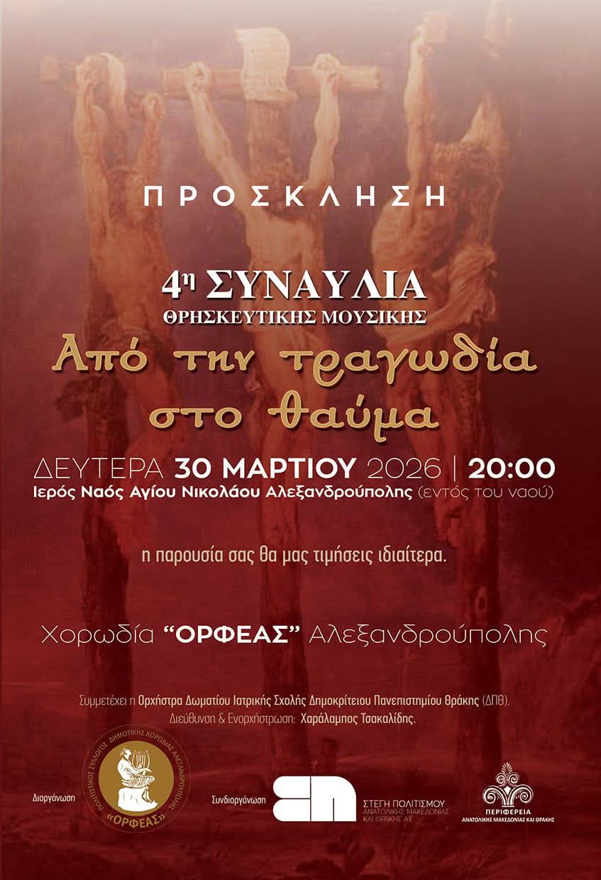 20:00 - 22:30 4η Συναυλία Θρησκευτική Μουσικής – Από την τραγωδία στο Θαύμα 30 Μαρτίου @ 20:00 - 22:30 4η Συναυλία Θρησκευτική Μουσικής – Από την τραγωδία στο Θαύμα