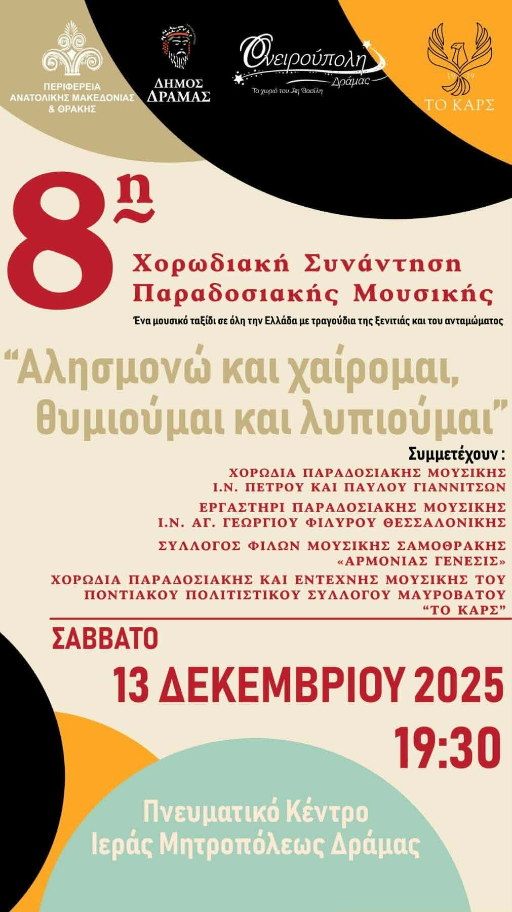 13 Δεκεμβρίου @ 19:30 - 21:30 8η Χορωδιακή Συνάντηση Παραδοσιακής Μουσικής Πνευματικό Κέντρο Ιεράς Μητρόπολης Δράμας