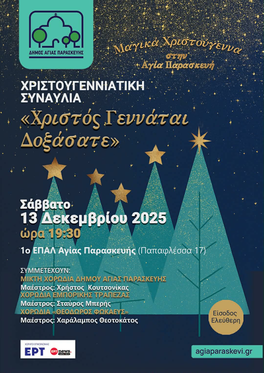 13 Δεκεμβρίου @ 19:30 - 21:00 Χριστός Γεννάται Δοξάσατε – Χριστουγεννιάτικη Συναυλία 1ο ΕΠΑΛ Αγίας Παρασκευής