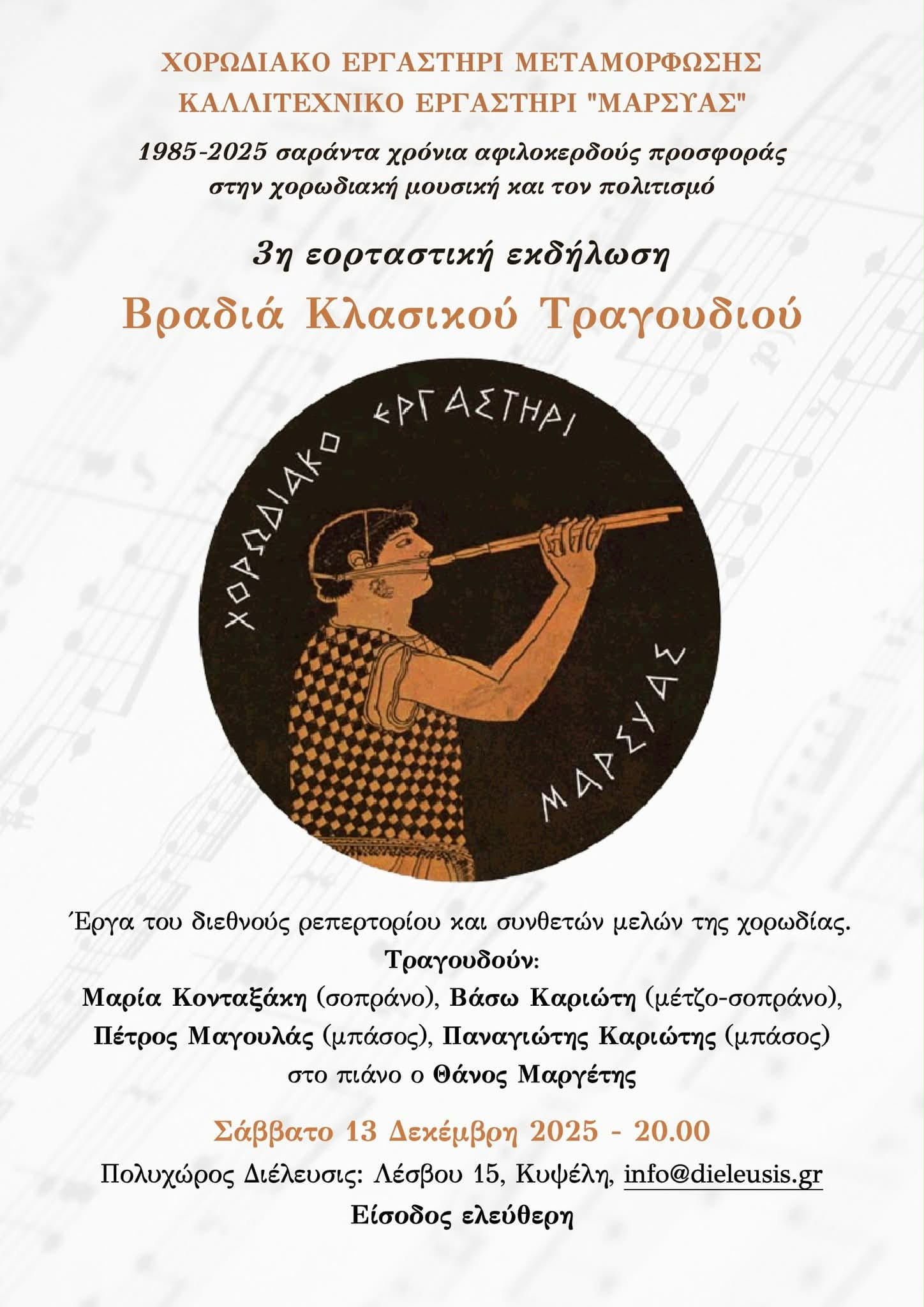 13 Δεκεμβρίου @ 20:00 - 22:00 Βραδιά Κλασικού Τραγουδιού – Χορωδιακό Εργαστήρι ΜΑΡΣΥΑΣ Πολυχώρος Πολιτισμού «διέλευσις» Λέσβου 15 & Πόρου, Αθήνα, Κυψέλη