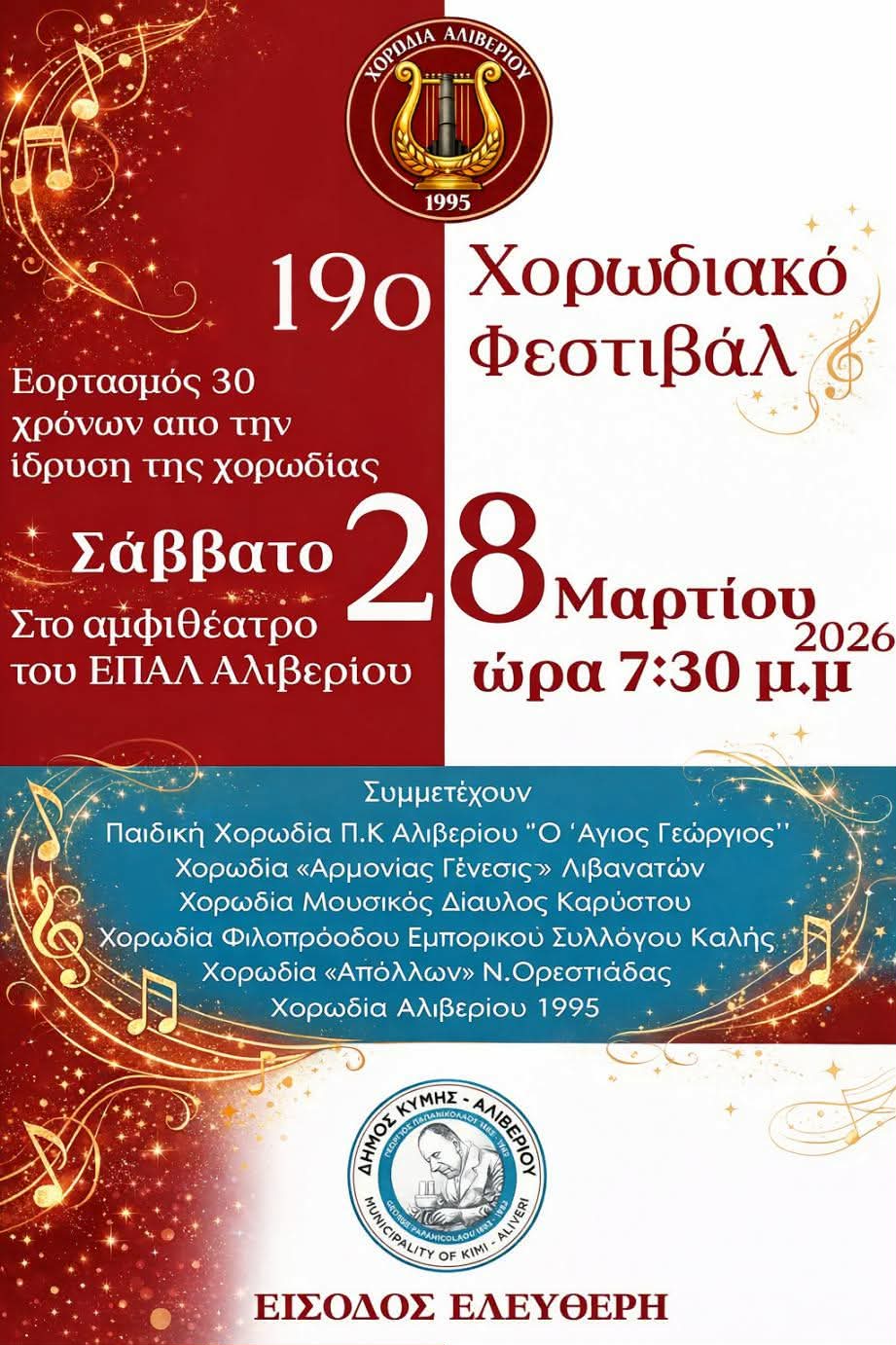 2026-02-07 4ο Φεστιβάλ Πολυφωνικής Χορωδίας Χαλκίδας 4ο Φεστιβάλ Πολυφωνικής Χορωδίας Χαλκίδας 7 Φεβρουαρίου @ 19:00 - 8 Φεβρουαρίου @ 19:30 4ο Φεστιβάλ Πολυφωνικής Χορωδίας Χαλκίδας