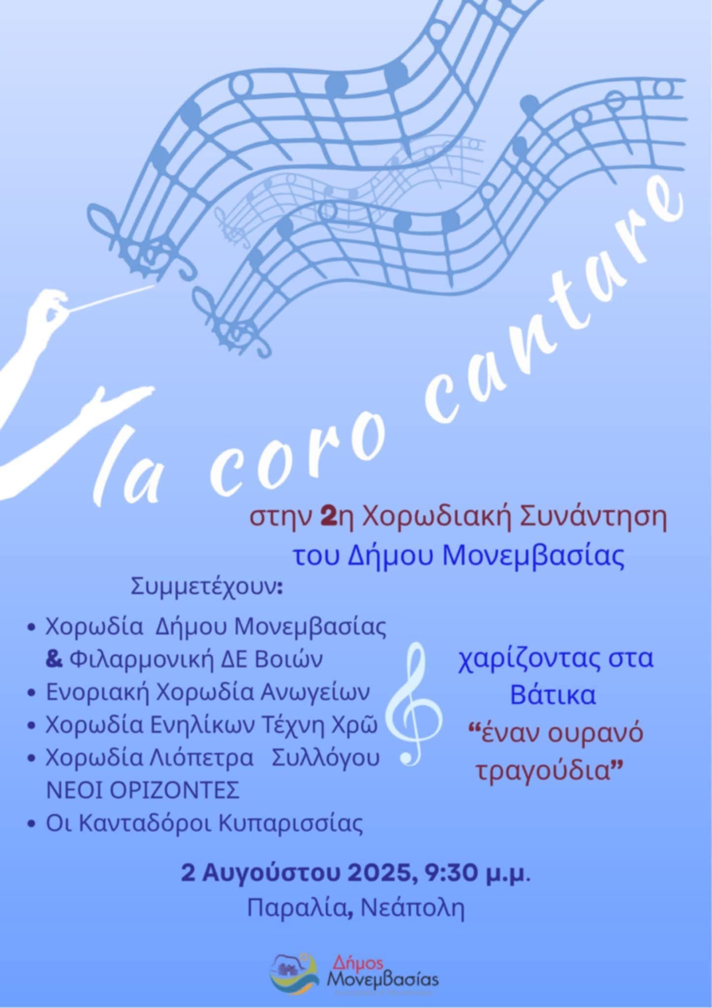 21:30 - 23:00 La coro cantare στη 2η Χορωδιακή Συνάντηση Δήμου Μονεμβασιάς 2 Αυγούστου @ 21:30 - 23:00 La coro cantare στη 2η Χορωδιακή Συνάντηση Δήμου Μονεμβασιάς