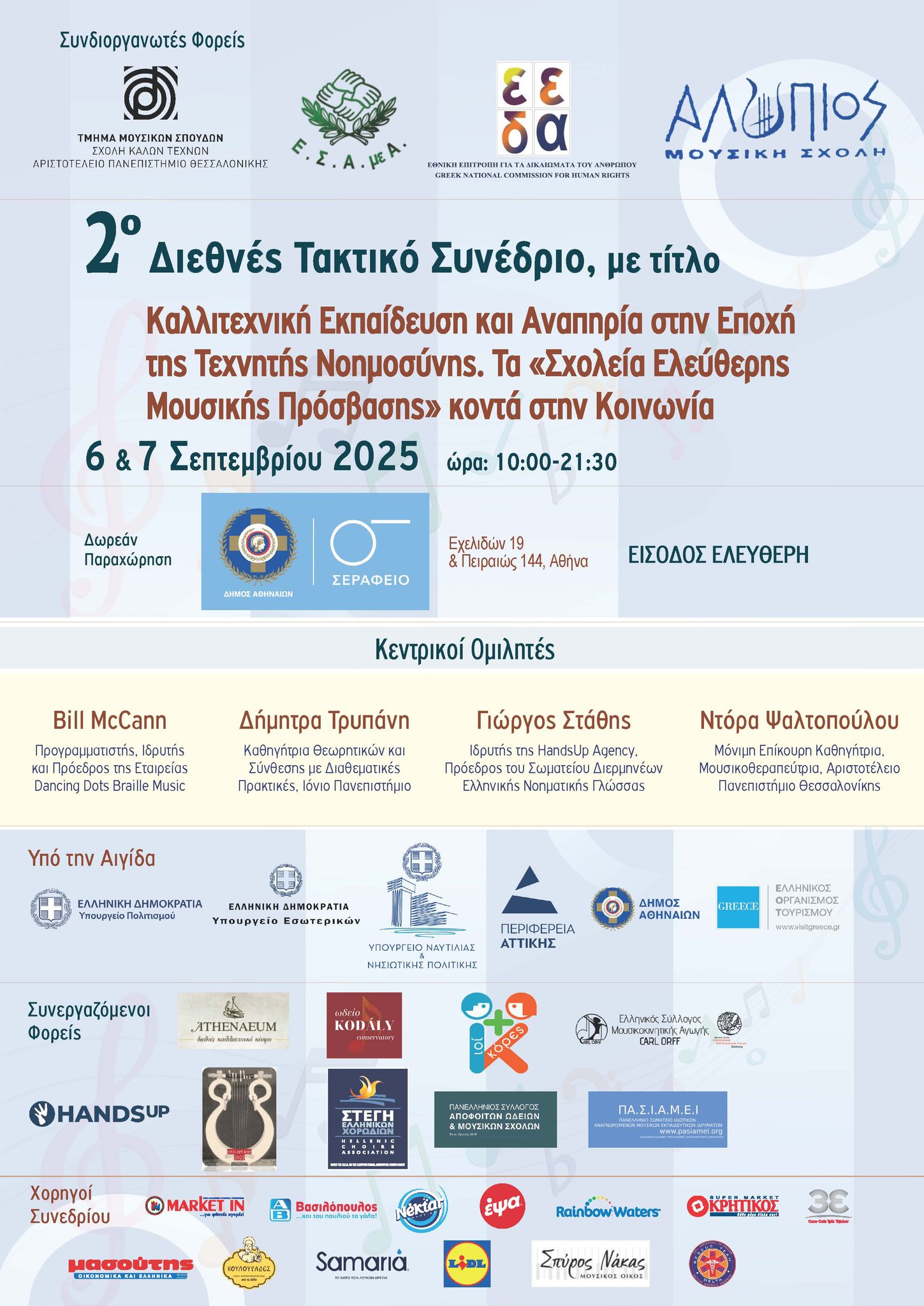 2ο Διεθνές Τακτικό Συνέδριο – «Καλλιτεχνική Εκπαίδευση και Αναπηρία στην Εποχή της Τεχνητής Νοημοσύνης. Τα ῾Σχολεία Ελεύθερης Μουσικής Πρόσβασης’ κοντά στην Κοινωνία»