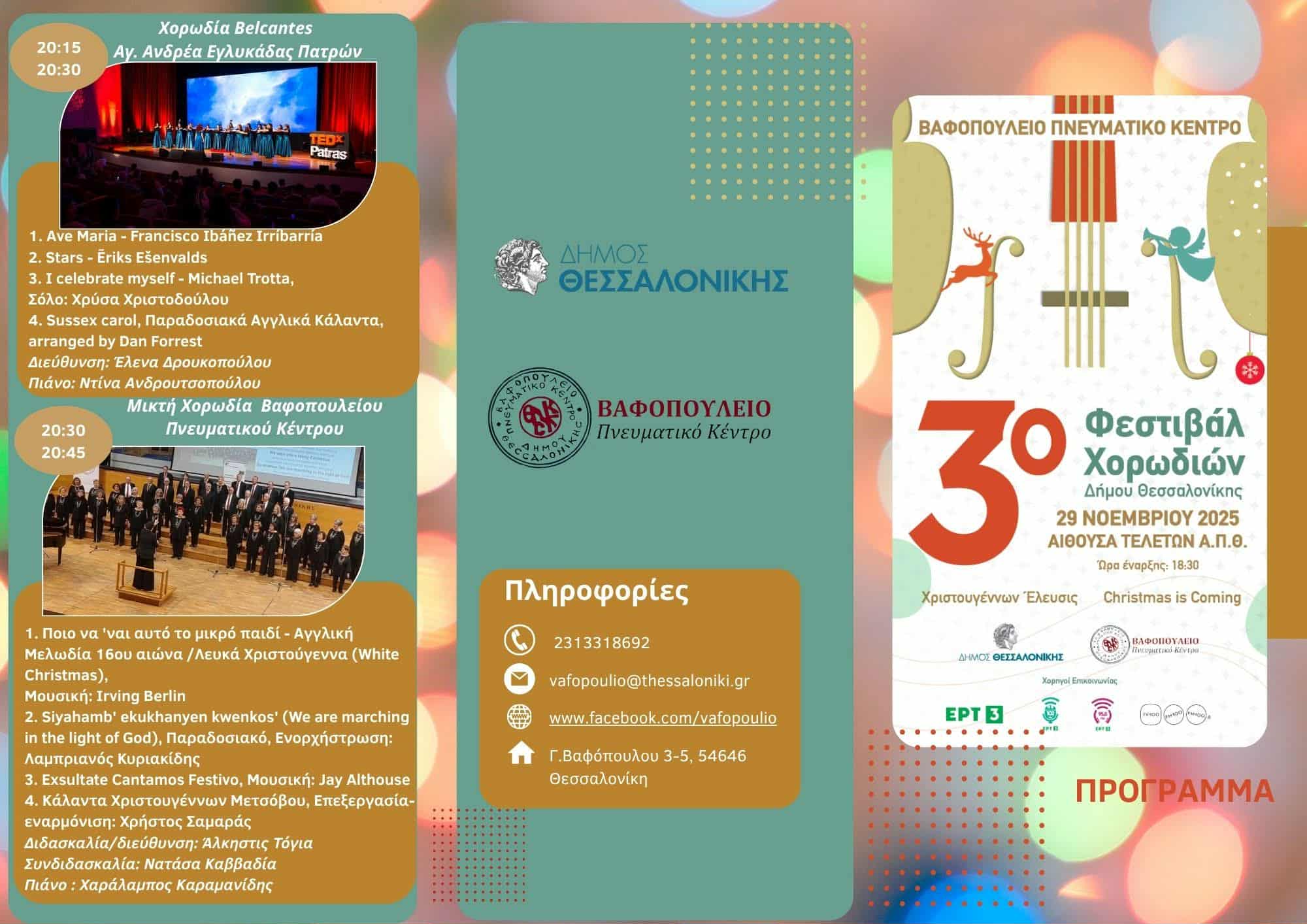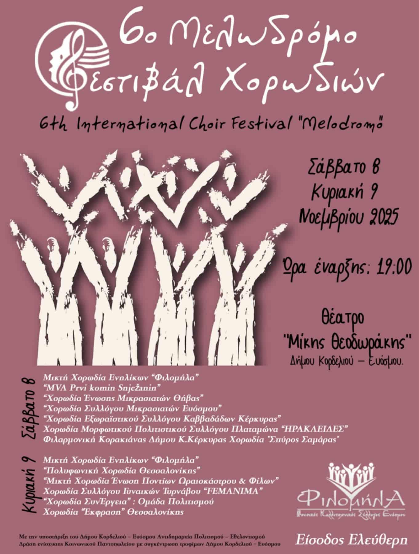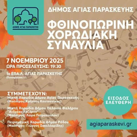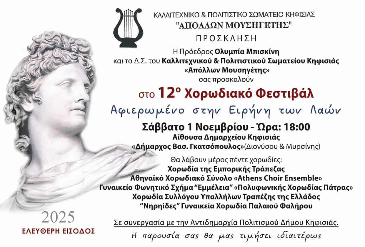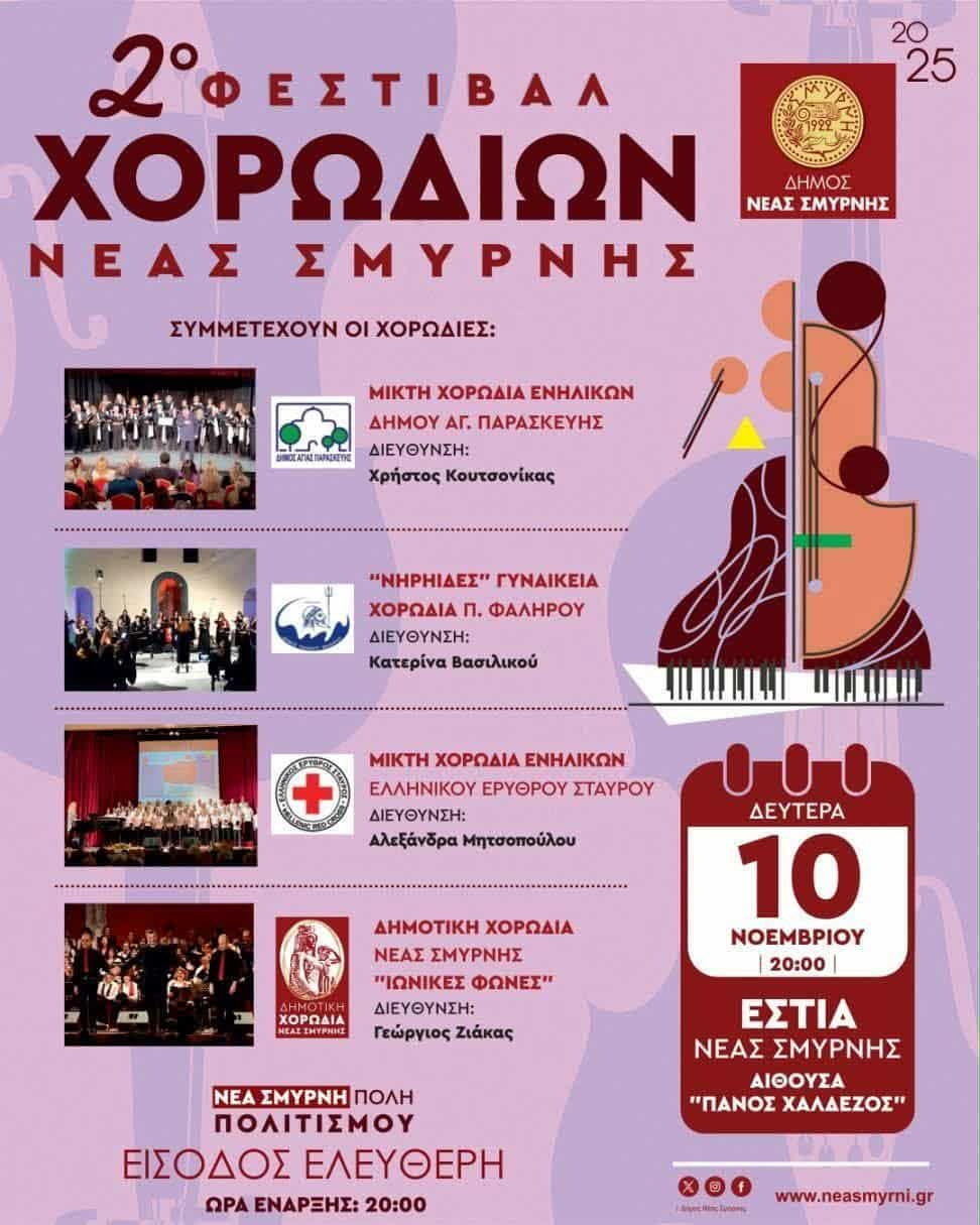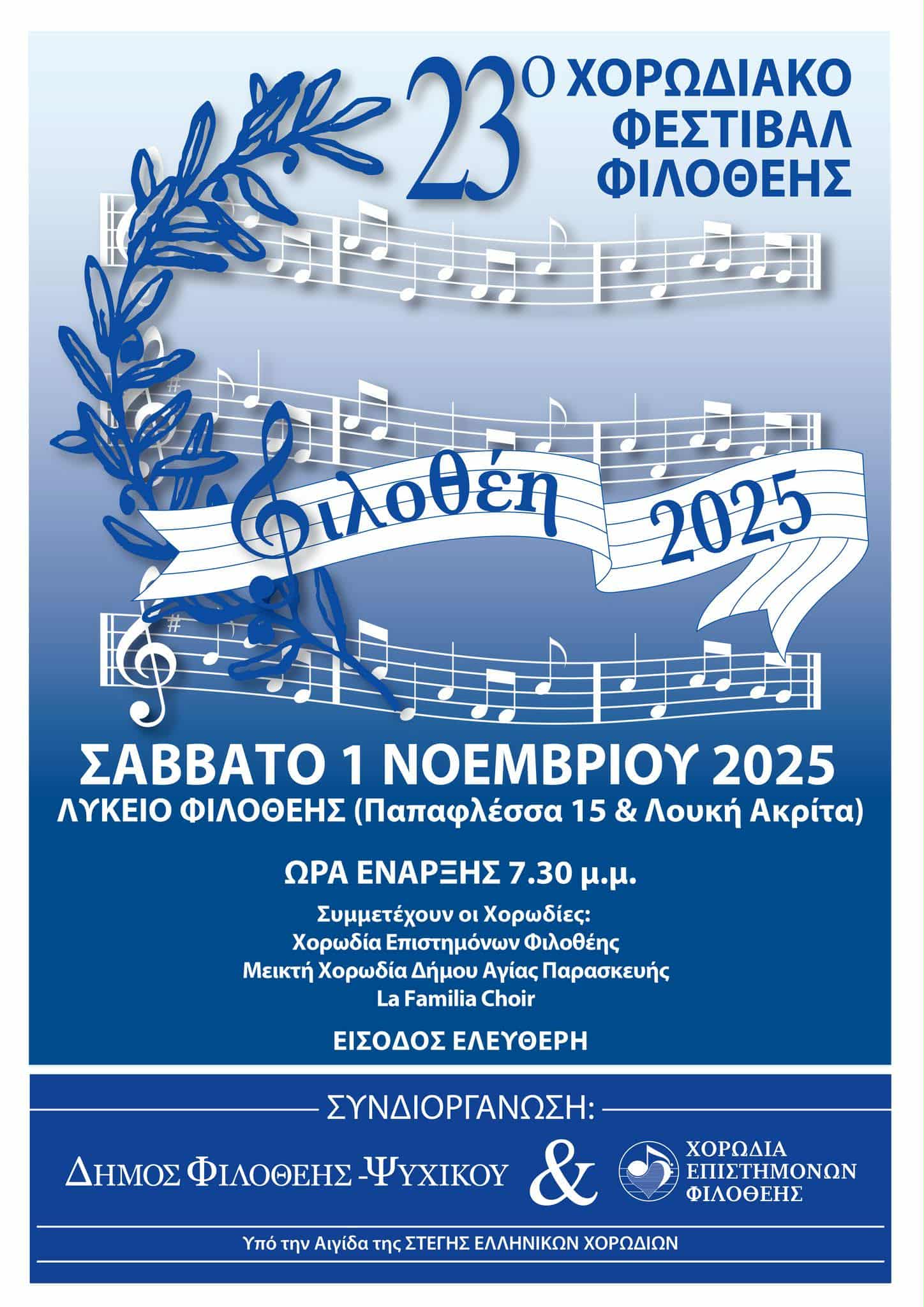 Η Χορωδία Επιστημόνων Φιλοθέης και ο Δήμος Φιλοθέης-Ψυχικού διοργανώνουν το 23ο Χορωδιακό Φεστιβάλ Φιλοθέης την 1η Νοεμβρίου 2025 στις 7:30 μ.μ. στο Λύκειο Φιλοθέης (Παπαφλέσσα 15). Συμμετέχουν Η Χορωδία Επιστημόνων Φιλοθέης με μαέστρο τον Θωμά Λουζιώτη, η Μεικτή Χορωδία του Δήμου Αγίας Παρασκευής με μαέστρο τον Χρήστο Κουτσονίκα και η La Familia Choir με μαέστρο ...