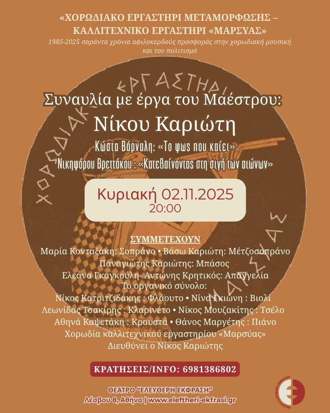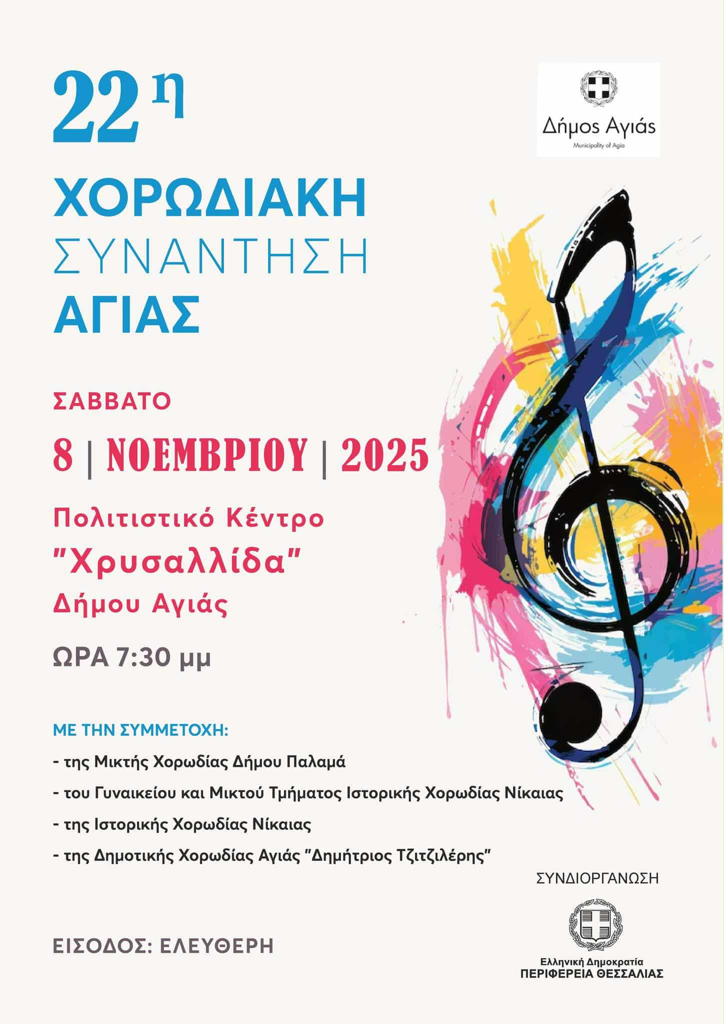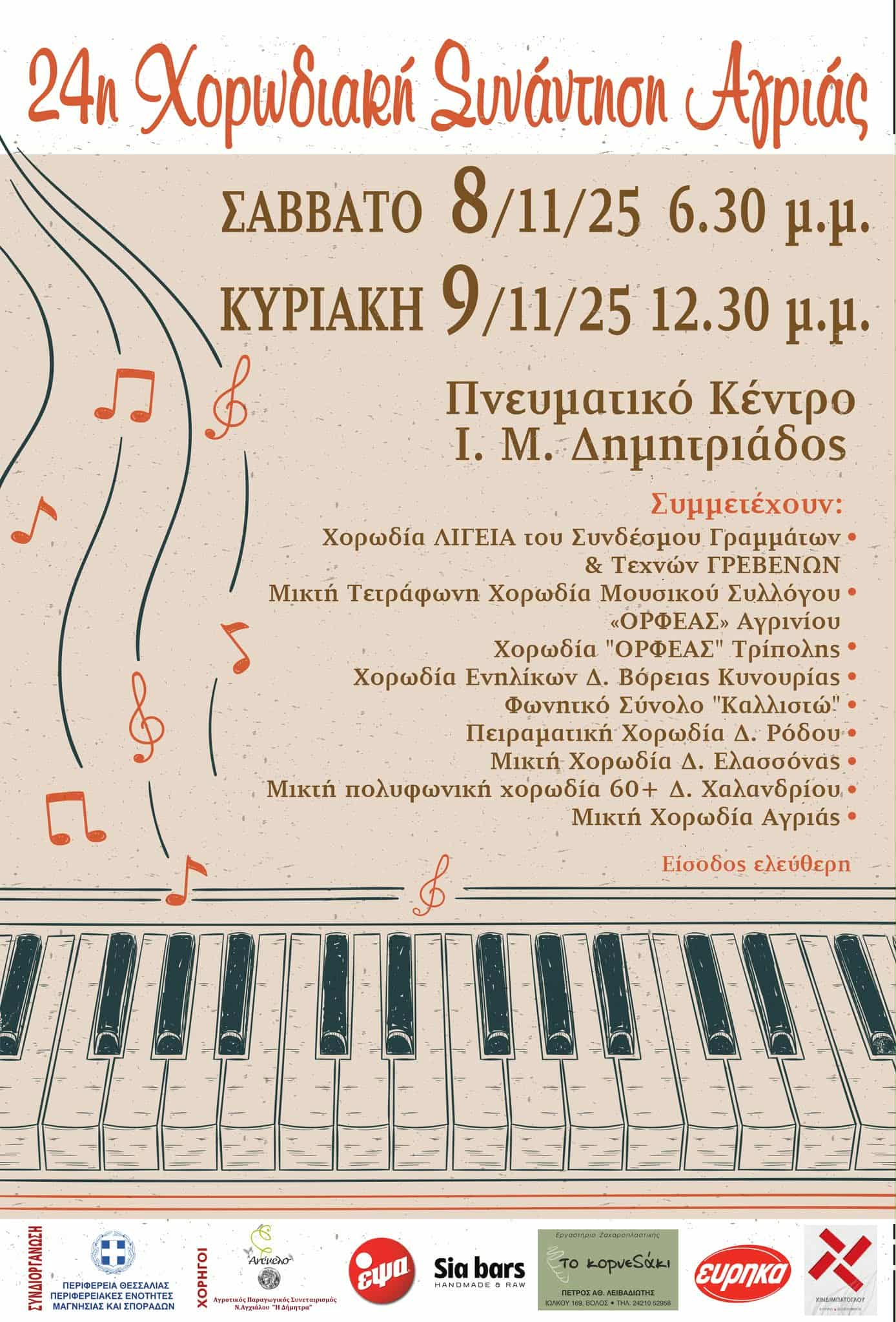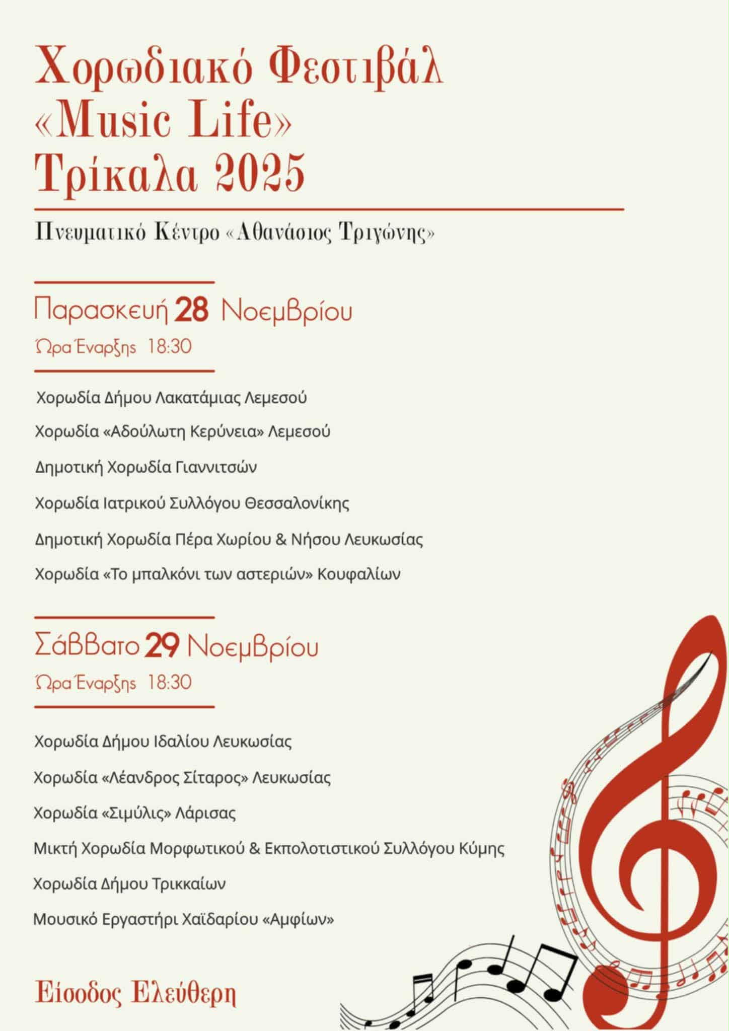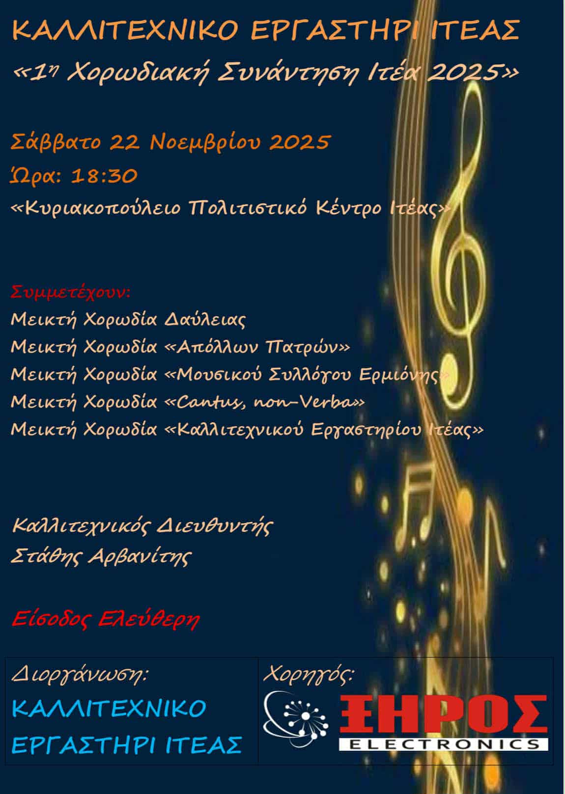 Η Χορωδία Επιστημόνων Φιλοθέης και ο Δήμος Φιλοθέης-Ψυχικού διοργανώνουν το 23ο Χορωδιακό Φεστιβάλ Φιλοθέης την 1η Νοεμβρίου 2025 στις 7:30 μ.μ. στο Λύκειο Φιλοθέης (Παπαφλέσσα 15). Συμμετέχουν Η Χορωδία Επιστημόνων Φιλοθέης με μαέστρο τον Θωμά Λουζιώτη, η Μεικτή Χορωδία του Δήμου Αγίας Παρασκευής με μαέστρο τον Χρήστο Κουτσονίκα και η La Familia Choir με μαέστρο ...