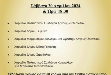 Τα χορωδιακά Φεστιβάλ “Music Life” με την συνεργασία του Δήμου Άργους Μυκηνών και με αφορμή τα 50 χρόνια από την τουρκική εισβολή στην Κύπρο, σας προσκαλούνε στο Ελληνοκυπριακό Χορωδιακό Φεστιβάλ πο ...