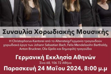 Μία συναυλία μοναδικού χαρακτήρα θα γίνει στη ϊ .. Η διεθνούς φήμης χορωδία νέων - της πόλης Altensteig στη Γερμανία, θα παρουσιάσει έργα θρησκευτικής μουσικής διαφόρων Ευρωπαίων συνθετών για χορωδία ...